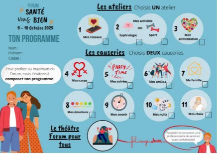 Ce jeudi 9 octobre nos élèves de 4ème se sont rendus à Ploërmel pour un forum "Santé vous bien". Animé par de nombreux professionnels nos élèves ont participé à un théâtre forum sur le thème des addictions aux écrans. Ils ont eu également le choix entre des causeries ou des ateliers. Plusieurs thèmes abordés : le sommeil, mes amis, les réseaux, mes soirées, mon corps, la famille, la sophrologie... un temps précieux pour nos élèves sur des sujets qui les rejoignent.